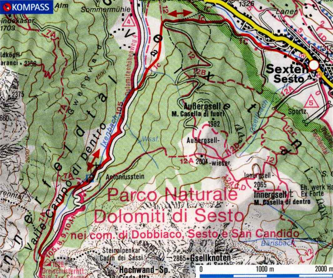 The tour begins in the shade, but without a view; in the valley, the Haunold (2966 m) and its satellites first come into view, and only later the mighty massif of the Dreischusterspitze (3145 m), from which mighty streams of debris descend to the valley floor. The Dreischusterhütte, nicely situated on the edge of the Innerfeld, is then both hiking destination and starting point for larger undertakings: to the Hochebenkofel (see Tour 23) or to the great Drei-Zinnen-Blick at the Schwabenalpenkopf (see Tour 24). The "Schuster", after all the highest peak in the Sesto Dolomites, is rarely climbed - such long, arduous tours, garnished with plenty of scree and only halfway rewarding climbing towards the end, have long since gone out of fashion. From the hotel in Moos, hike to Sesto (1316 m), across the valley stream and along its left bank downstream to the bridge in the industrial area on the edge of the settlement. Here take the forest track in the Schmiedenwald uphill to the large hairpin bend above the mouth of the Innerfeldtal valley. Now straight ahead (sign) and first flat, then slightly downhill to the Ixenbach and the lower car park (1334 m) in the valley. Away from the asphalt band, moderately steep into the valley, past the upper car park (1490 m) and with increasingly clear views to the Dreischusterhütte (1626 m). Descent on the ascent path.
