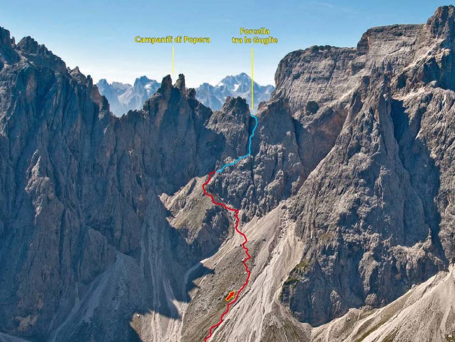 Difficoltà e informazioni generali: scalata difficile e in parte molto ripida, a volte richiede la forza delle braccia; la qualità della roccia, inoltre, lascia spesso a desiderare. In presenza di altri alpinisti il pericolo di caduta massi è maggiore. Le funi d’acciaio mal tese e le grandi distanze tra gli ancoraggi richiedono piede fermo e sufficente esperienza nell’ambiente montano!Le sicure della ferrata Roghel rientrano senza dubbio nella categoria del “ferro vecchio”!La scalata non può essere effettuata come escursione a sé stante, dato che non c’è un percorso di discesa facile e breve e in ogni caso è necessario superare l’impegnativa Cengia Gabriella. In caso di temporali, o forte pioggia, questo percorso è assolutamente da evitare (pericolo di consistenti cadute sassi e frane). Avvicinamento: dal Rifugio Lunelli (1568 m) si segue la segnaletica per il Rifugio Berti. Poco sotto il rifugio si deve attraversare il torrente. Lì, subito prima del ponte, si procede lungo una salita ben visibile (nessuna segnaletica e nessuna segnatura) a sinistra fino al sentiero un po’ più largo, segnavia N. 152 (segnatura). Lo si segue a sinistra fi no a quando un cartello (ferrata Roghel) indica come proseguire. Il sentiero segnato con punti rossi porta in ripida salita all’attacco della ferrata. Informazioni sul percorso: ci sono vie ferrate di gran lunga più belle della ferrata Roghel. Ma, inserita nell’anello del Monte Popera, per l’alpinista ben allenato e competente, è un’esperienza stimolante e grandiosa dal punto di vista del paesaggio. L’ascesa termina alla Forcella tra le Guglie (2540 m). Caratteristiche e dettagli tecnici: scalata diffi cile, assicurata quasi completamente con fune d’acciaio, con alcuni passaggi molto ripidi (spesso con gradini d’aiuto). La fune d’acciaio, in parte decisamente vecchia, è tesa in maniera mobile e lenta, gli ancoraggi troppo distanti tra loro, questo può mettere in difficoltà lo scalatore che sta dietro. Per questa salita è richiesta una buona tecnica di scalata e una solida esperienza alpina. Una caduta nella fune d’acciaio, non esattamene affidabile, potrebbe avere conseguenze fatali. Inoltre, la roccia è spesso scheggiabile e friabile, con rischio di caduta massi, e quindi richiede attenzione quando si procede in compagnia di altri escursionisti. Discesa in direzione Cengia Gabriella: sul versante posteriore della Forcella tra le Guglie si scende dapprima lungo cenge (funi d’acciaio) verso sinistra verso il fianco ovest della Prima Guglia di Stallata e si prosegue scendendo alla gola detritica ai piedi della parete. Questa porta giù fi no al punto più basso del sentiero (2300 m) nell’alta valle del Ciadin di Stallata (ca. 240 m dislivello in discesa, 45 minuti). Un po’ più sotto, a 2219 m, si trova il Bivacco Battaglione Cadore.